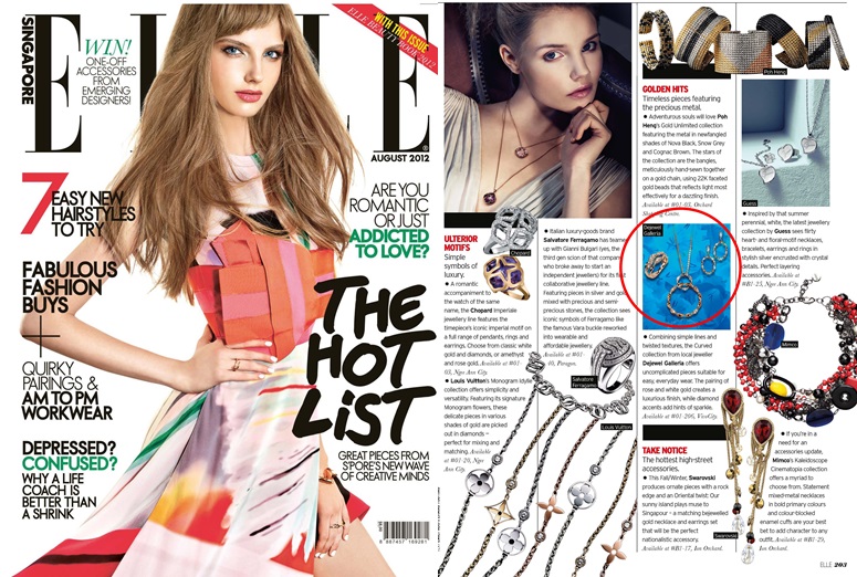 ELLE features Dejewel Galleria’s elegant Curved Collection is its August 2012 issue. The curved collection This offers a directional and dimensional range of contemporary pieces that takes inspiration from the everyday basics and youthfulness in life.